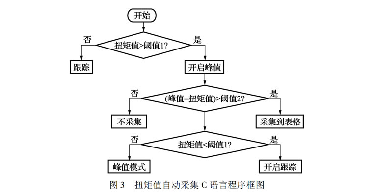 大多數(shù)儀表只具有顯示功能不具有數(shù)據(jù)采集和分析功能,校準(zhǔn)人員在校準(zhǔn)時(shí),一邊操作校準(zhǔn)裝置,一邊用筆記錄校準(zhǔn)數(shù)據(jù)。這樣不但工作效率低還容易出錯(cuò)。為了方便校準(zhǔn)員做記錄,儀表專門設(shè)計(jì)了數(shù)據(jù)采集功能,采集表格形式完全按照 JGJ707—2014《扭矩扳子檢定規(guī)程》的表格形式[7,這樣方便后面的計(jì)算和出證書。儀表采用具有C語(yǔ)言功能的觸摸屏作為顯示終端。校準(zhǔn)人員可以通過(guò)設(shè)定最大扭矩值和采集觸發(fā)值, 實(shí)現(xiàn)扭矩值的自動(dòng)采集。并根據(jù)采集數(shù)據(jù)進(jìn)行平均值和示值相對(duì)誤差和示值重復(fù)性的計(jì)算。C 語(yǔ)言程[8]框圖如圖3 所示。其中閾值1表示進(jìn)入峰值模式的判斷條件,閾值2表示采集峰值判斷條件。當(dāng)扭矩值超過(guò)閾值 1,儀表自動(dòng)從跟蹤模式變?yōu)榉逯的J。?dāng)峰值和當(dāng)前的扭矩值之差大于閾值 2 時(shí),程序會(huì)將峰值自動(dòng)采集到表格中,然后解除峰值功能。閾值1和2的設(shè)定根據(jù)智能傳感器的量程來(lái)計(jì)算得到。本設(shè)備中閾值1為傳感器滿量程值的5%,閾值2為滿量程值的2/3。