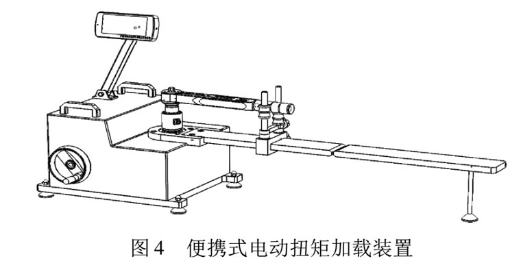 為方便現(xiàn)場(chǎng)檢定使用,整個(gè)設(shè)備必須方便攜帶。因此檢定裝置的支撐臂采用可折疊式,扭矩傳感器也采用直插式,現(xiàn)場(chǎng)不需任何工具就可以安裝和拆卸加載裝置。智能儀表采用可伸縮支架固定,方便調(diào)整角度。整個(gè)裝置的結(jié)構(gòu)示意圖如圖 4 所示。因?yàn)榇蟛糠值默F(xiàn)場(chǎng)裝置考慮到電源的問(wèn)題, 所以多是采用手動(dòng)加載的方式。這樣在被檢扳手從剛裝上到加上扭矩會(huì)有一段空行程, 全部采用手動(dòng)加載,一方面比較費(fèi)力,另一方面工作效率也不高。因此,在加載方式上采用手動(dòng)和電動(dòng)相結(jié)合的方式,裝置中加一個(gè)儲(chǔ)能式電機(jī)來(lái)實(shí)現(xiàn)空行程的電動(dòng)加載,節(jié)省人力,提高效率, 當(dāng)空行程結(jié)束傳感器加上力后就可以改成手動(dòng)加載。