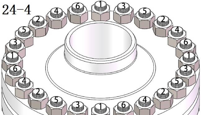首先,我們來(lái)優(yōu)先了解一下四同步液壓扳手預(yù)緊管殼式換熱器法蘭螺栓的螺栓編序。可以參照下圖,將法蘭螺栓總數(shù)平分為四部分,每一部分選第一顆作為定位螺栓編序號(hào)“1”,編號(hào)“2”取每組最中間螺栓,下來(lái)的編號(hào)都是取每次平分之后的中間螺栓依次編號(hào)直到編完為止。